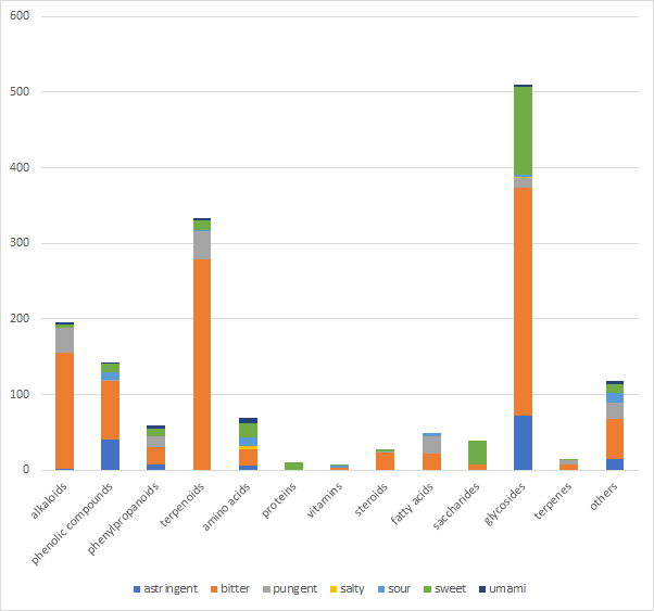 Distribution of tastes/orosensations on chemical classes in PlantMoleculartasteDB